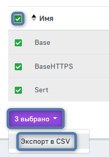 На данный момент единственное доступное групповое действие в системе — Экспорт в CSV. При его выборе, файл в формате .csv, содержащий записи таблицы, попадает в менеджер загрузки вашего браузера.