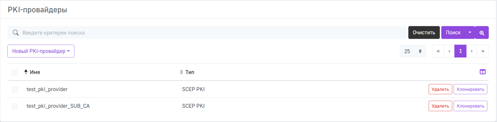 - Тип — поиск по типу, выбранному для PKI-провайдера.