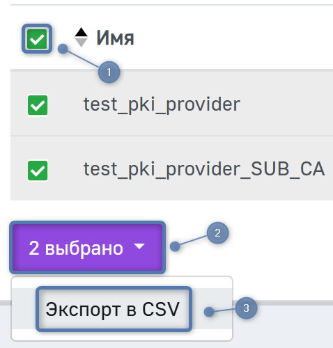 Для того чтобы выполнить действия с несколькими PKI-провайдерами, отметьте необходимые PKI-провайдеры. Чтобы выполнить действия со всеми PKI-провайдерами в списке, нажмите на селектор
