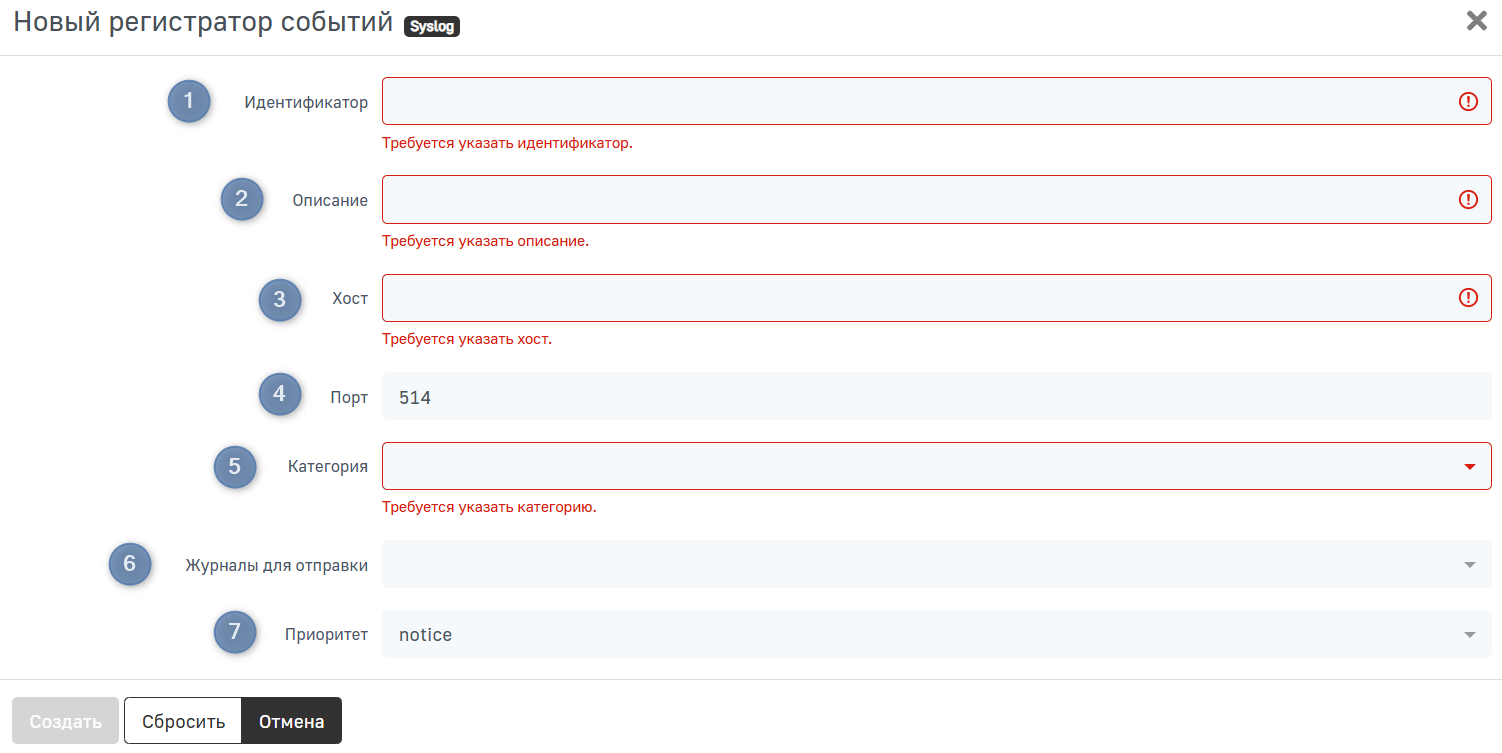 Для того чтобы создать новый регистратор событий, заполните параметры конфигурации и нажмите Создать. Чтобы сбросить введенные параметры на стандартные значения, нажмите Сбросить. Для возвращения на предыдущую страницу без сохранения выполненных на странице действий, нажмите Отменить.