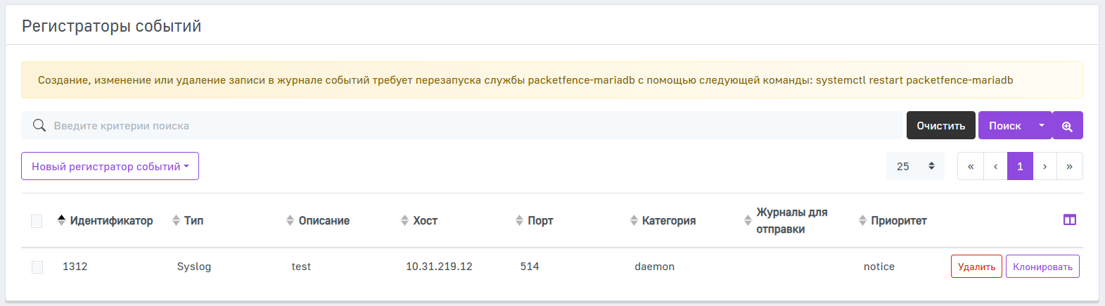 Для того чтобы найти определенный регистратор событий, можно выполнить поиск по критериям: Идентификатор, Описание, Хост, Порт, Категория, Журналы для отправки, Приоритет. Введите интересующий критерий в поле поиска и нажмите Поиск. Нажмите Очистить, чтобы сбросить критерии поиска.