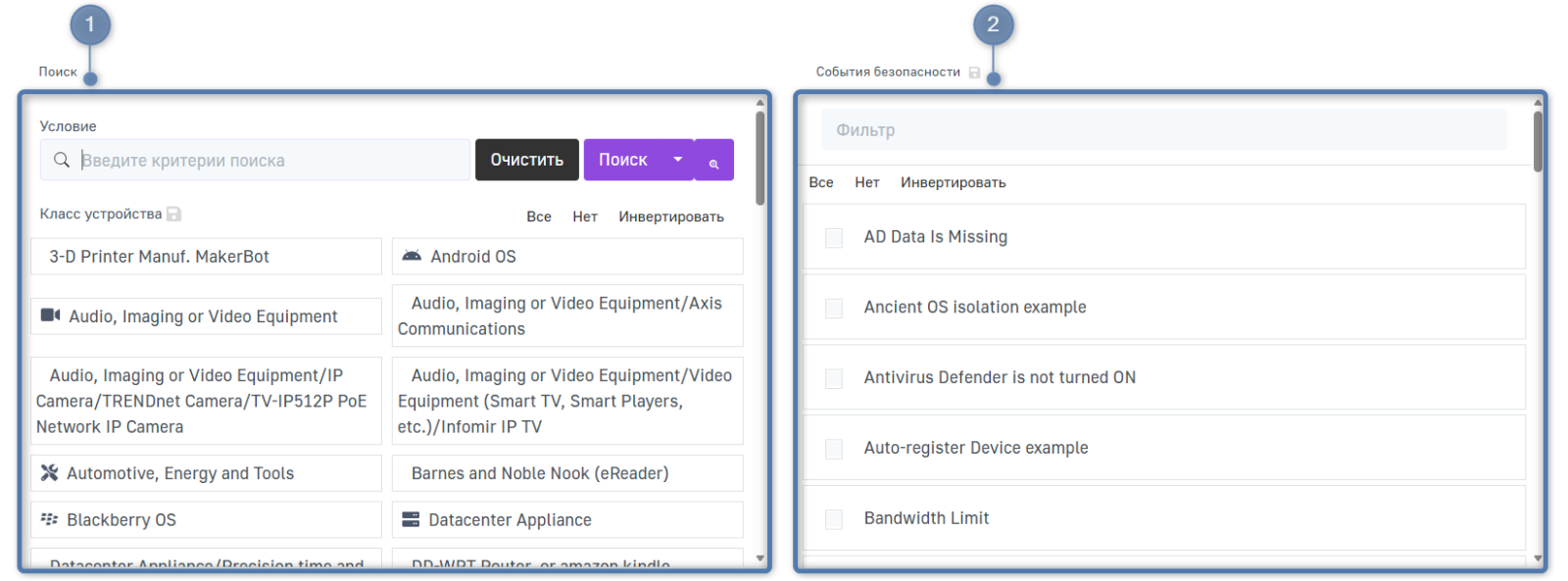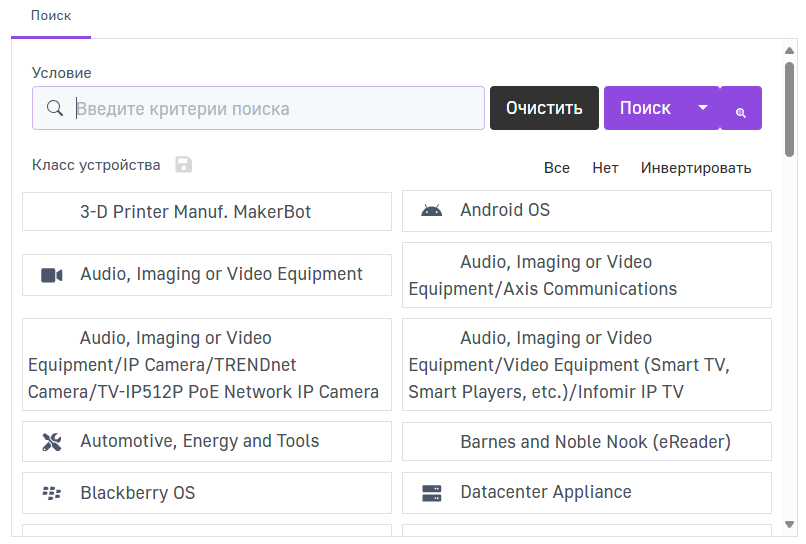 Нажмите на нужный класс устройств, чтобы сократить поиск и анализировать события безопасности только определенных классов устройств.