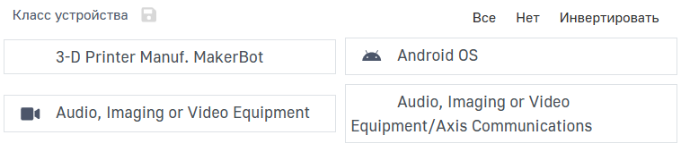Для того чтобы выбрать все классы устройств, нажмите Все. Чтоб инвертировать выбранные классы, нажмите Инвертировать. Если необходимо отменить выбор, нажмите Нет.