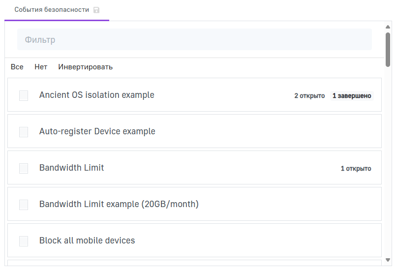 Для того чтобы выполнить действия с несколькими событиями безопасности, отметьте необходимые события безопасности. Чтобы выполнить действия со всеми событиями безопасности в списке, нажмите на селектор