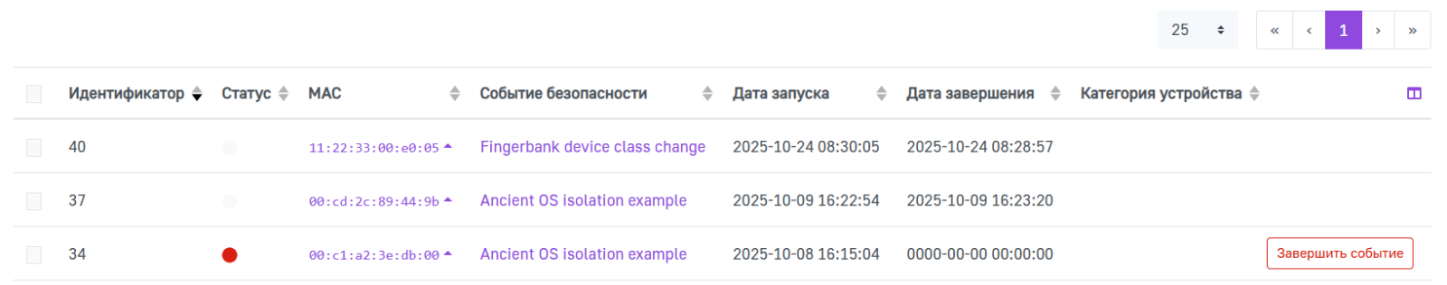 Чтобы посмотреть подробную информацию о событии безопасности, нажмите на нужное событие. Для просмотра подробной информации об устройстве, нажмите на его MAC-адрес. При необходимости, вы можете завершить событие безопасности, для этого нажмите