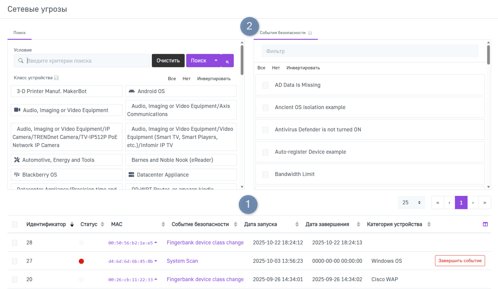 - Поиск — фильтрация по параметрам события безопасности;
