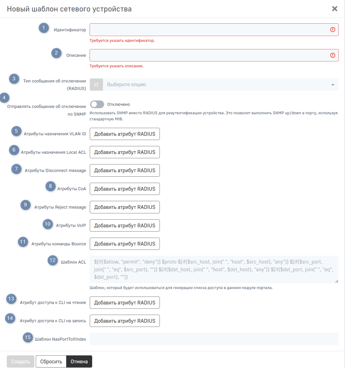 Для того чтобы создать новый шаблон сетевого устройства, заполните параметры конфигурации и нажмите Создать. Чтобы сбросить введенные параметры на стандартные значения, нажмите Сбросить. Для возвращения на предыдущую страницу без сохранения выполненных на странице действий, нажмите Отменить. Поиск шаблона сетевого устройстваДля того чтобы найти определенный шаблон сетевого устройства, можно выполнить поиск по критериям: Идентификатор, Описание. Введите интересующий критерий в поле поиска и нажмите Поиск. Нажмите Очистить, чтобы сбросить критерии поиска.