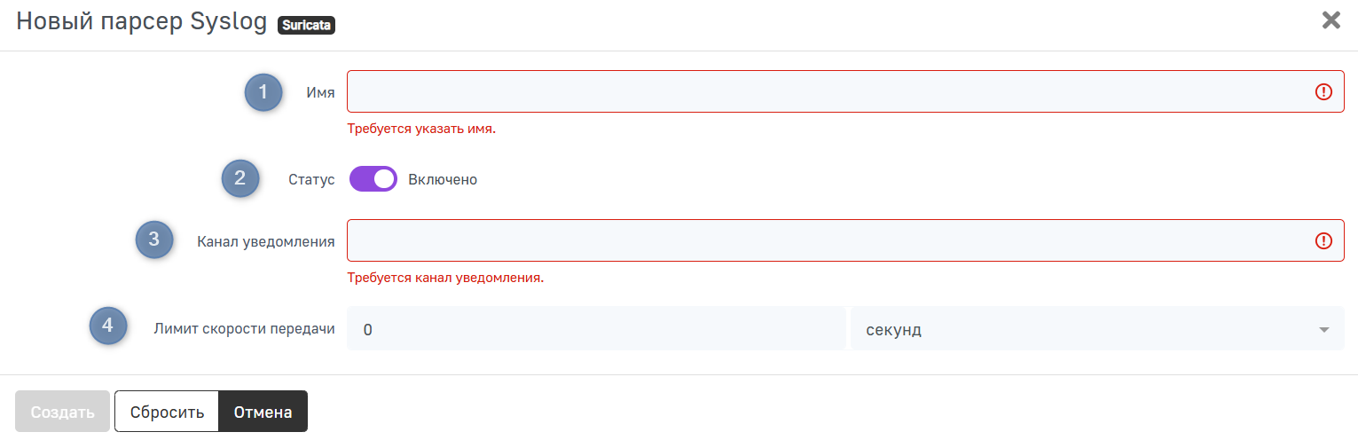 - Статус — при активации данного параметра парсер будет принимать и обрабатывать сообщения Syslog;