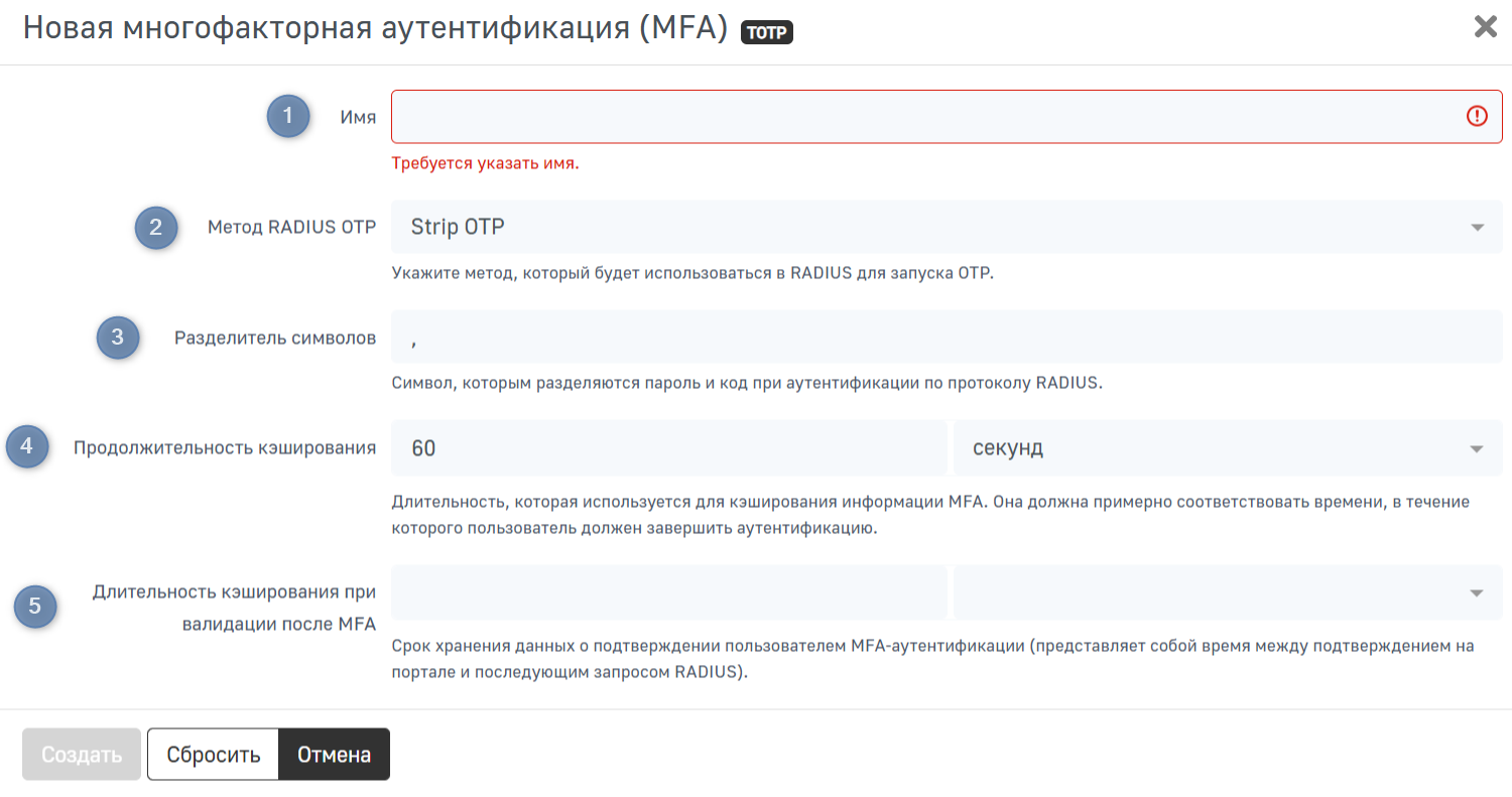 Для того чтобы добавить новую конфигурацию MFA, заполните параметры конфигурации и нажмите Создать. Чтобы сбросить введенные параметры на стандартные значения, нажмите Сбросить. Для возвращения на предыдущую страницу без сохранения выполненных на странице действий, нажмите Отменить.
