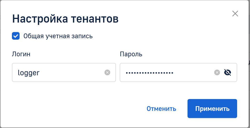 При активированном параметре Общая учетная запись, при добавлении тенанта с указанием учетных данных, Система будет использовать общую учетную запись при попытке подключения.