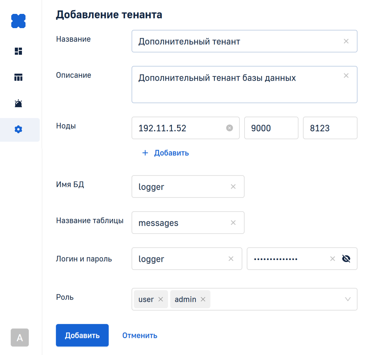 Поля Название и Хост должны быть уникальными для каждого добавляемого тенанта.