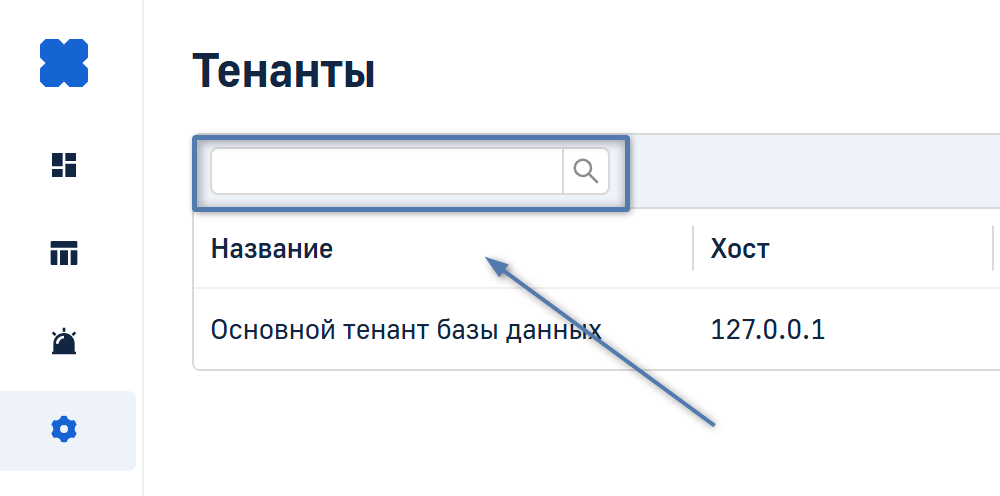 Для того, чтобы найти определенный тенант в списке, нажмите на форму поиска в левом верхнем углу таблицы и введите ключевое слово.
