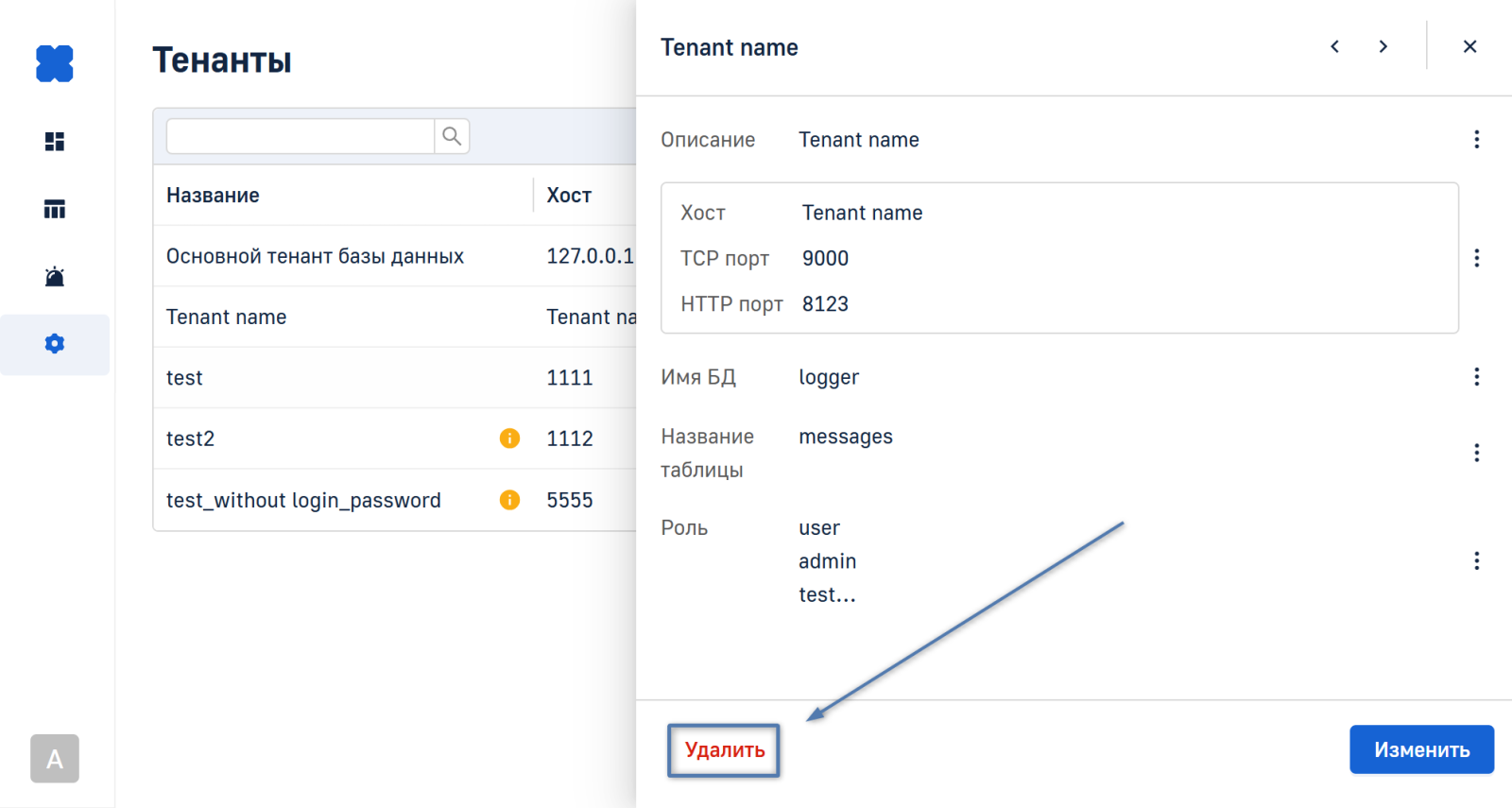 • Нажмите на тенант в списке, после чего нажмите кнопку Удалить в левом нижнем углу открывшегося модального окна;