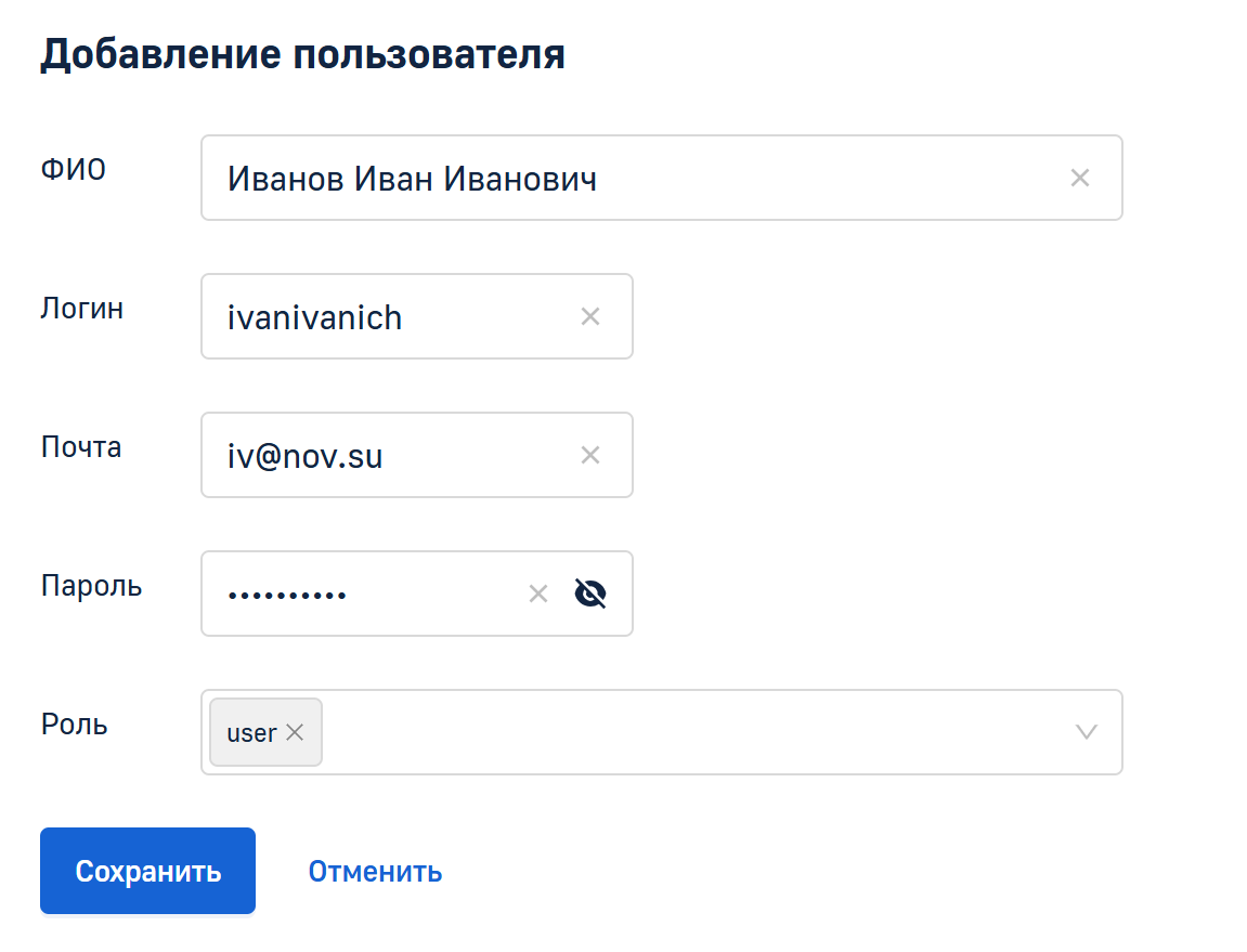 Для того, чтобы добавить нового пользователя, нажмите кнопку Добавить в правом верхнем углу страницы. При нажатии будет открыто модальное окно с полями ввода данных пользователя: