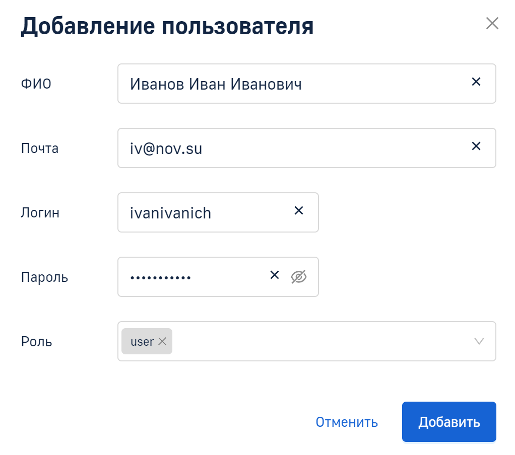 Для того, чтобы добавить нового пользователя, нажмите кнопку Добавить в правом верхнем углу страницы. При нажатии будет открыто модальное окно с полями ввода данных пользователя:
