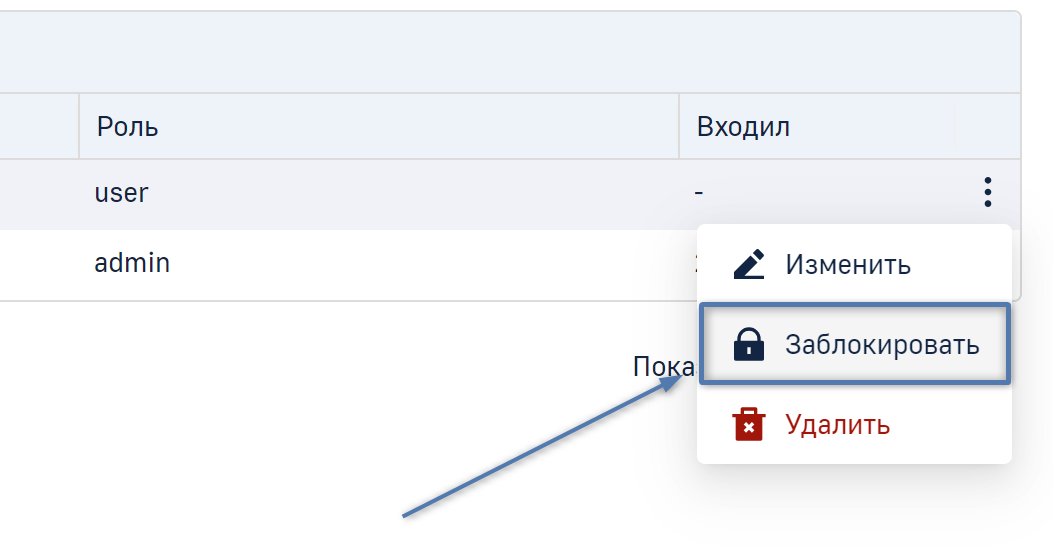 При нажатии будет открыта страница редактирования пользователя. Чтобы сохранить изменения, нажмите кнопку Сохранить в левом нижнем углу страницы. После этого вы будете автоматически перенаправлены на страницу со списком всех добавленных пользователей. Нажмите кнопку Отменить, чтобы сбросить все внесенные изменения. Блокировка и разблокировка пользователяБлокировка пользователя позволяет запретить пользователю доступ к системе, не удаляя его полностью. Для того, чтобы заблокировать пользователя: