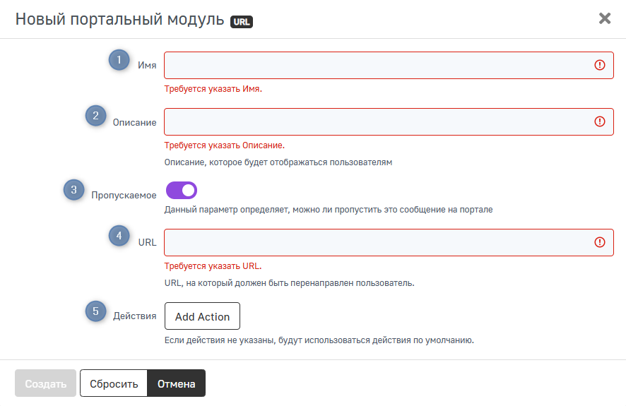 - Пропускаемое — при активации данного параметра перенаправление на указанный URL не будет происходить на портале;