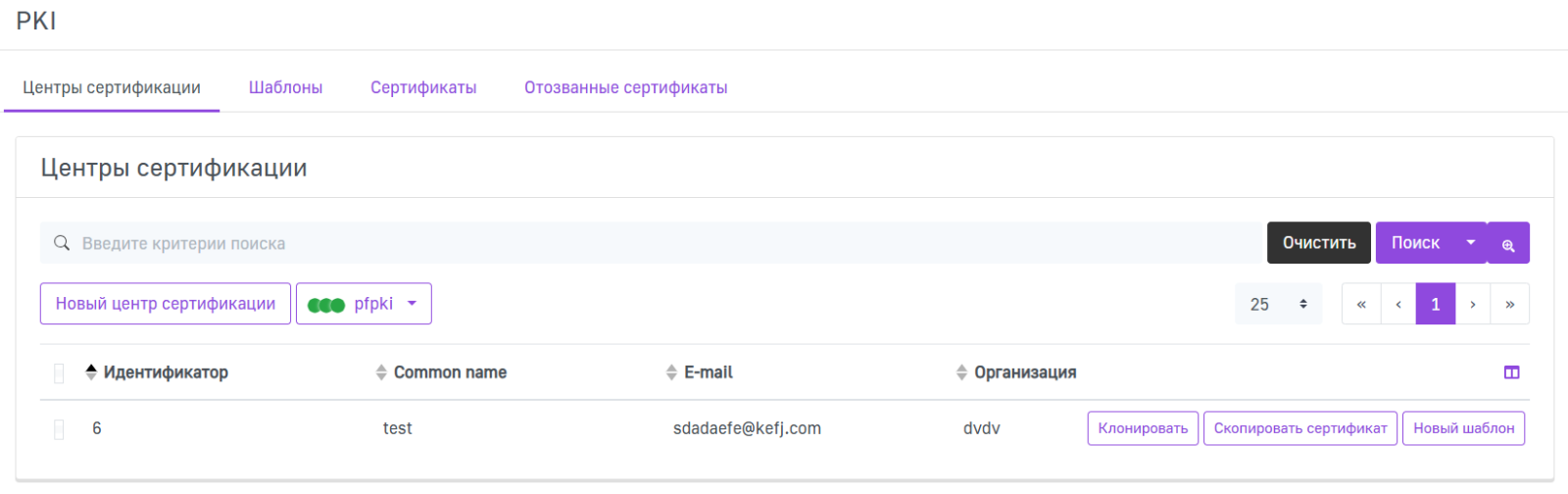 Для того чтобы добавить новый центр сертификации, заполните параметры конфигурации и нажмите Создать. Чтобы сбросить введенные параметры на стандартные значения, нажмите Сбросить. Для возвращения на предыдущую страницу без сохранения выполненных на странице действий, нажмите Отменить. Поиск центра сертификацииДля того чтобы найти определенный центр сертификации, можно выполнить поиск по критериям: Идентификатор, Common name, E-mail или Организация. Введите интересующий критерий в поле поиска и нажмите Поиск. Нажмите Очистить, чтобы сбросить критерии поиска.