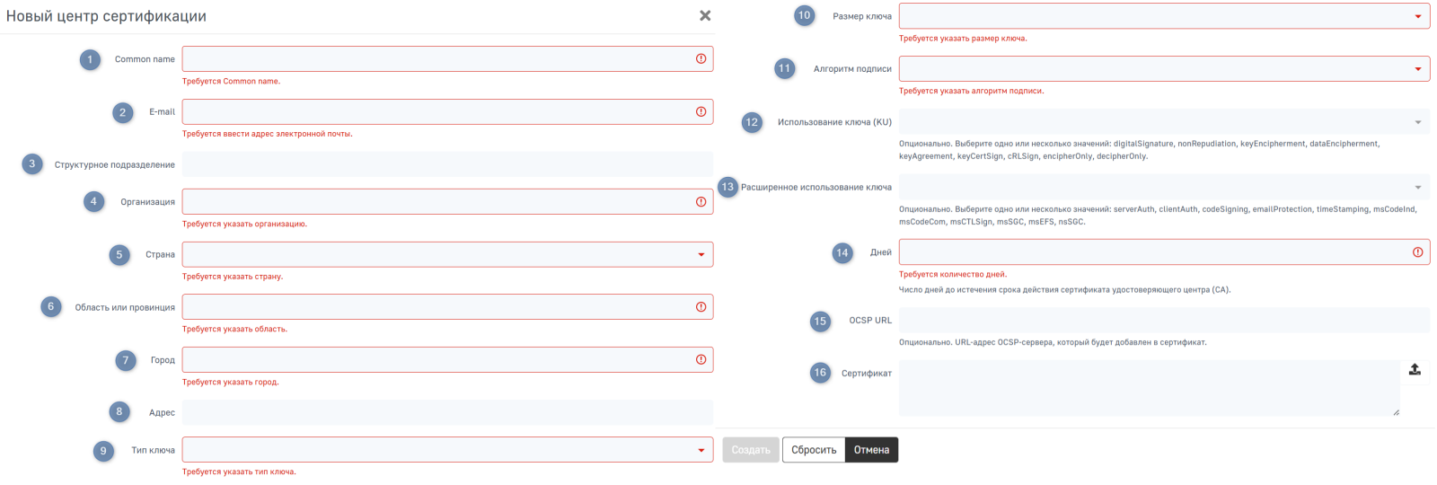 Создание нового центра сертификацииДля того чтобы создать новый центр сертификации, нажмите Новый центр сертификации в левом верхнем углу страницы. После этого откроется меню конфигурации центра сертификации.
