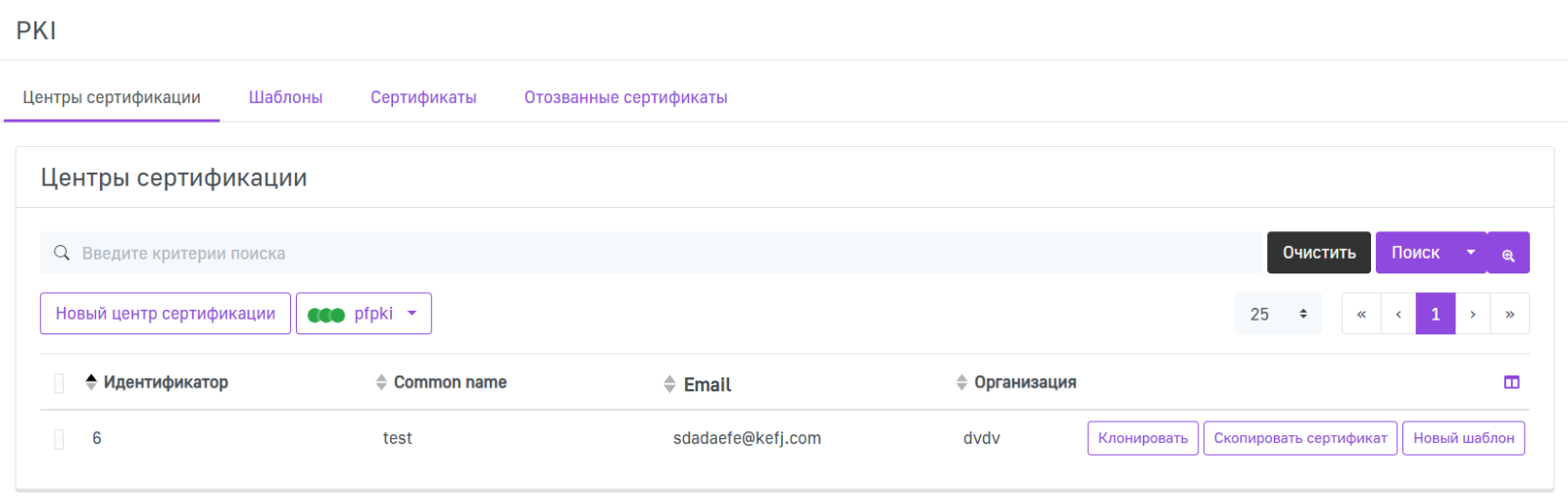 Для того чтобы добавить новый центр сертификации, заполните параметры конфигурации и нажмите Создать. Чтобы сбросить введенные параметры на стандартные значения, нажмите Сбросить. Для возвращения на предыдущую страницу без сохранения выполненных на странице действий, нажмите Отменить. Поиск центра сертификацииДля того чтобы найти определенный центр сертификации, можно выполнить поиск по критериям: Идентификатор, Common name, Email или Организация. Введите интересующий критерий в поле поиска и нажмите Поиск. Нажмите Очистить, чтобы сбросить критерии поиска.
