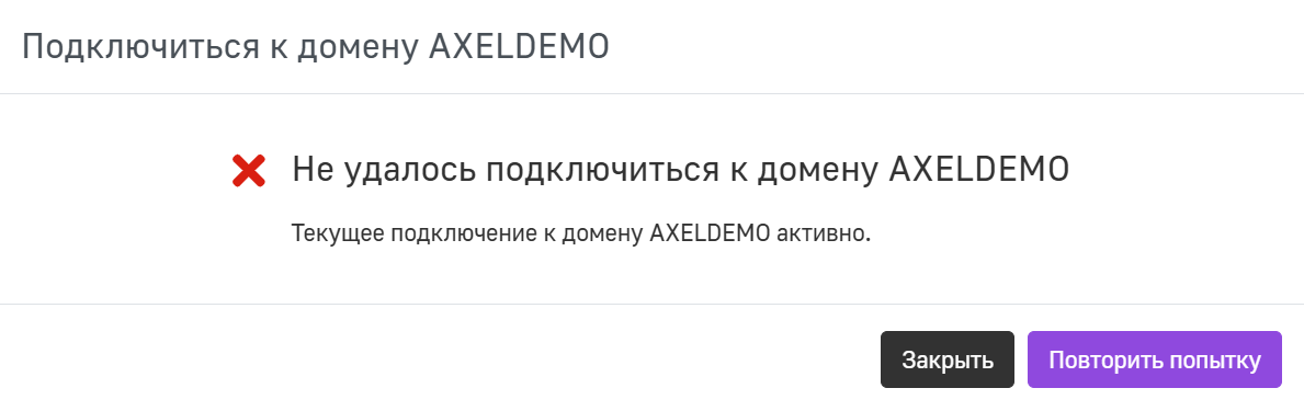Если при повторном присоединении к домену Active Directory указаны неверные учетные данные, система уведомит пользователя о неверных учетных данных и сообщит об успешном подключении к предыдущему домену.