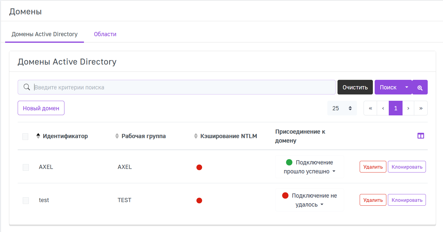Для того чтобы найти определенный домен, можно выполнить поиск по критериям: идентификатор или рабочая группа. Введите интересующий критерий в поле поиска и нажмите Поиск. Нажмите Очистить, чтобы сбросить критерии поиска.
