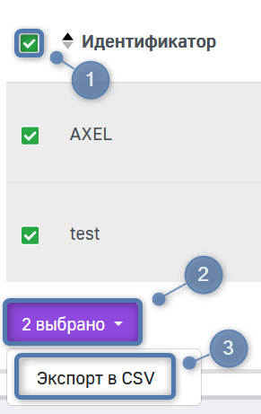 На данный момент единственное доступное групповое действие в системе — Экспорт в CSV. При его выборе, файл в формате .csv, содержащий записи таблицы, попадает в менеджер загрузки вашего браузера.