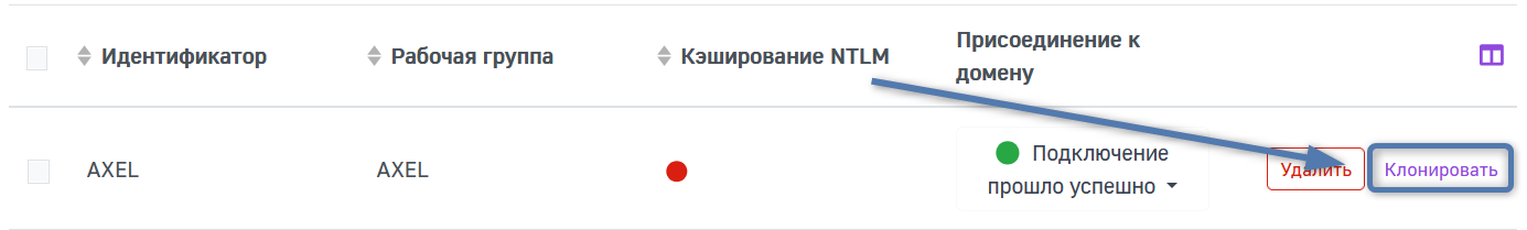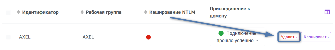 Вы можете отсортировать таблицу по Идентификатору, Рабочей группе, Кэшированию NLTM, Присоединению к домену в порядке алфавитного возрастания или убывания с помощью иконки