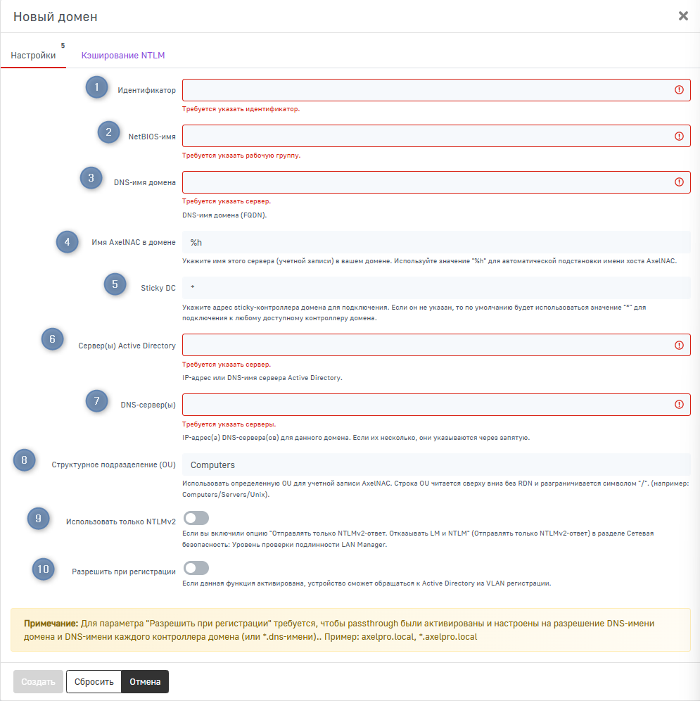 - Имя AxelNAC в домене — имя, которое будет иметь учетная запись сервера в Active Directory. Используйте значение "%h" для автоматической подстановки имени хоста AxelNAC;