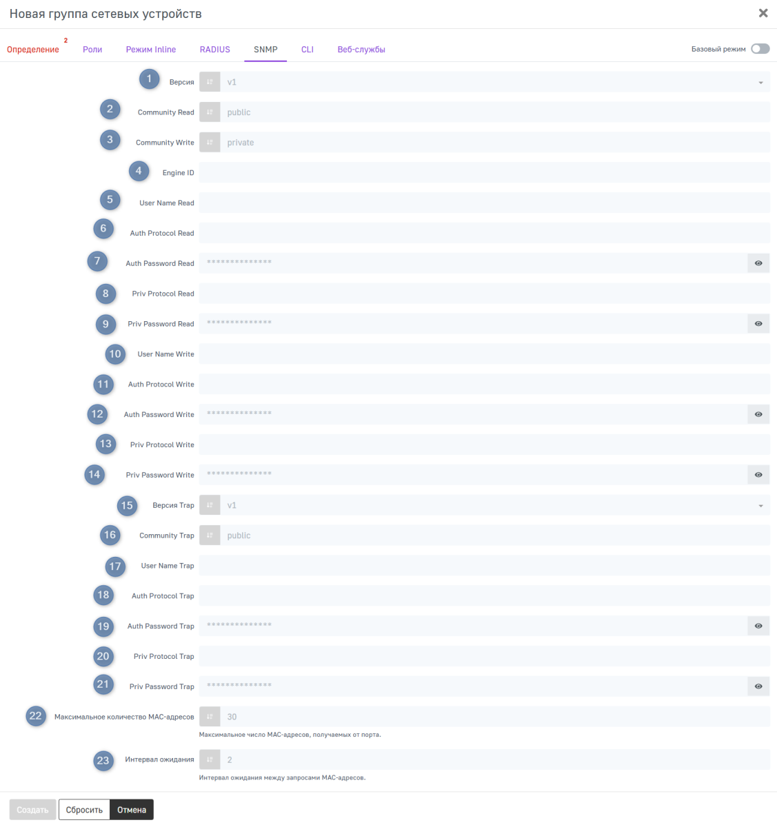 Для того чтобы создать новое сетевое устройство, заполните параметры конфигурации и нажмите Создать. Для того чтобы сбросить введенные параметры на стандартные значения, нажмите Сбросить. Для того чтобы вернуться на предыдущую страницу без сохранения выполненных на странице действий, нажмите Отменить.