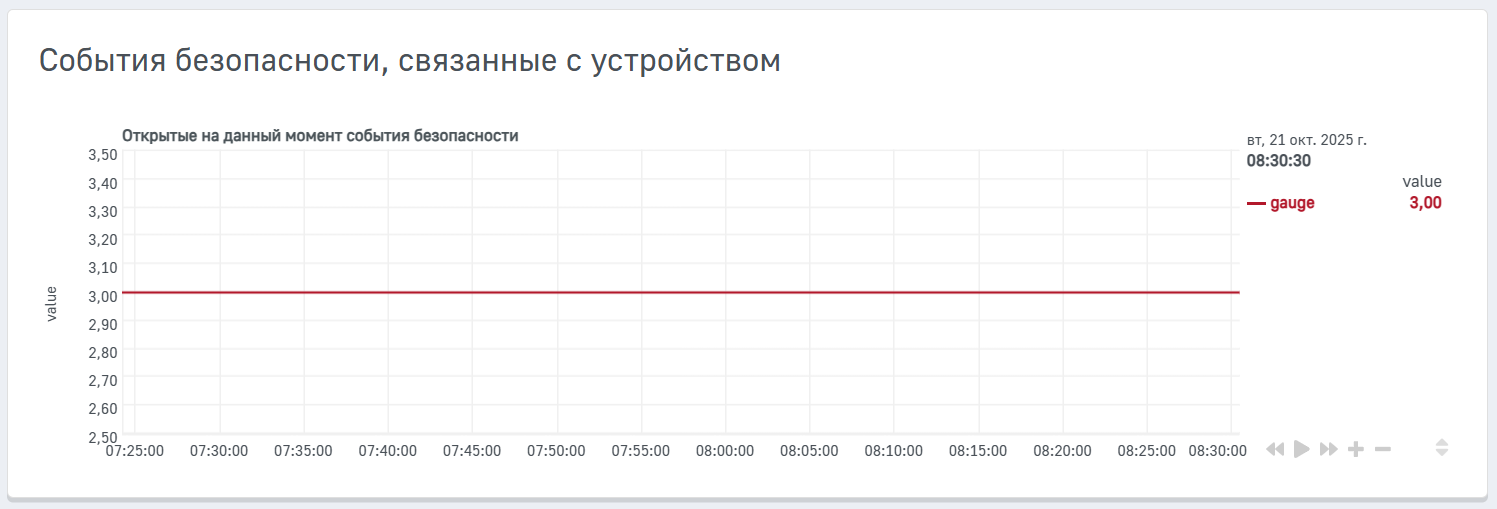 Блок События безопасности, связанные с устройством содержит график, отображающий количество открытых событий безопасности.