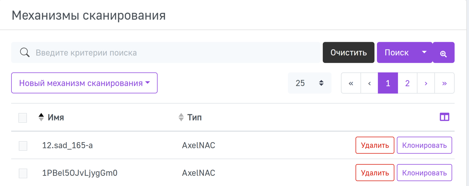 Для создания нового механизма сканирования нажмите Новый механизм сканирования и выберите из выпадающего списка AxelNAC.