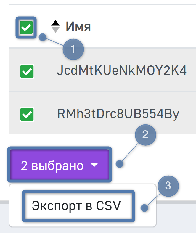На данный момент единственное доступное групповое действие в системе — Экспорт в CSV. При его выборе, файл в формате .csv, содержащий записи таблицы, попадает в менеджер загрузки вашего браузера.