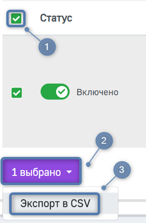 На данный момент единственное доступное групповое действие в системе — Экспорт в CSV. При его выборе, файл в формате .csv, содержащий записи таблицы, попадает в менеджер загрузки вашего браузера.