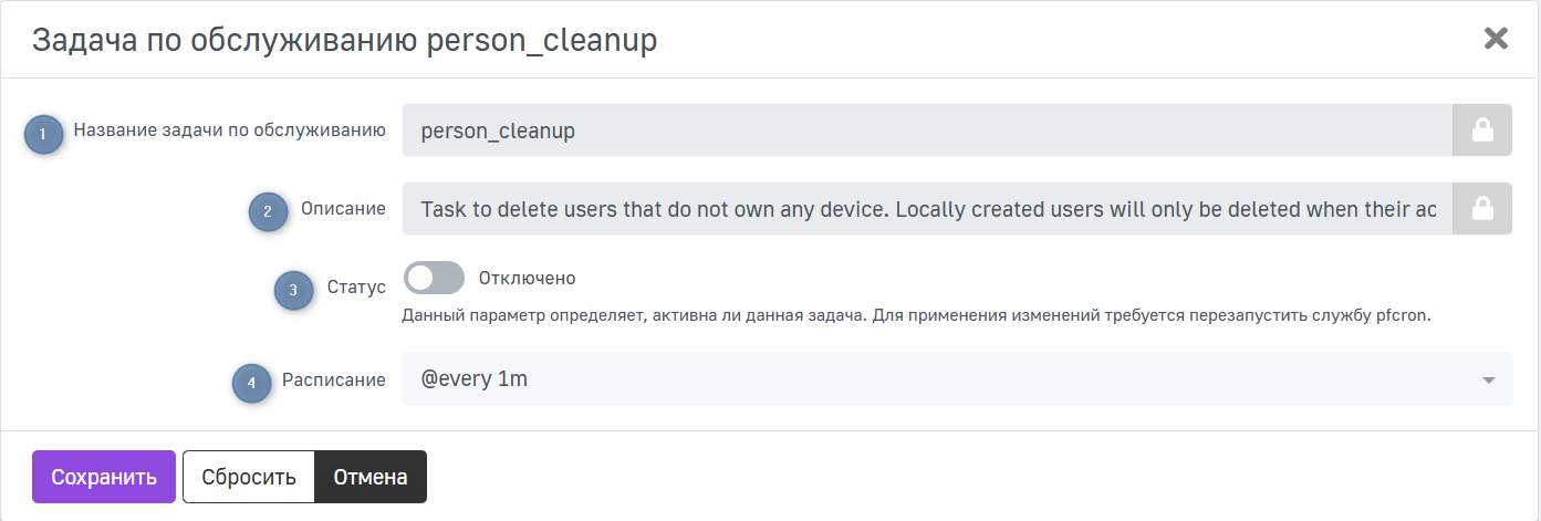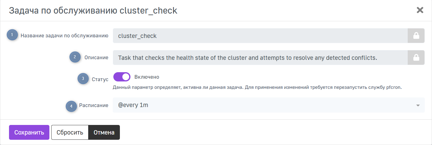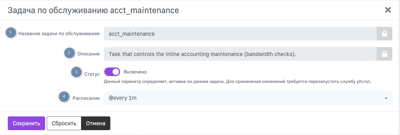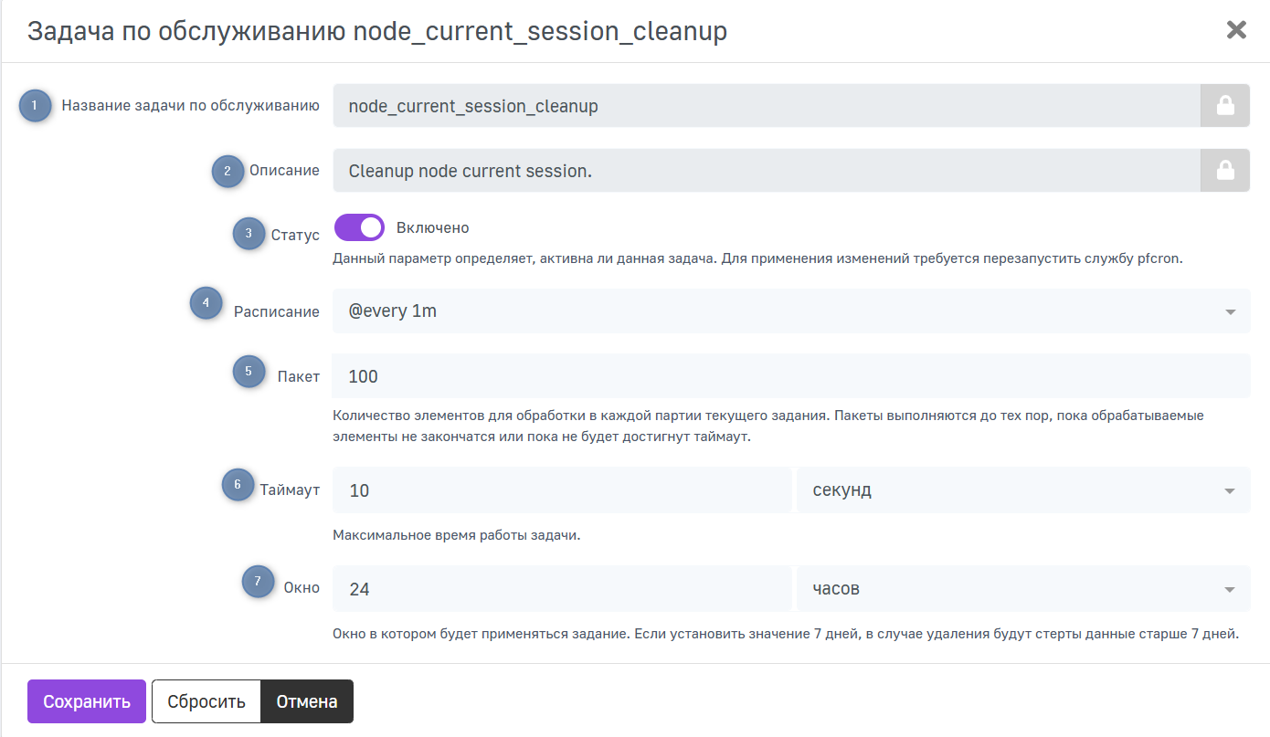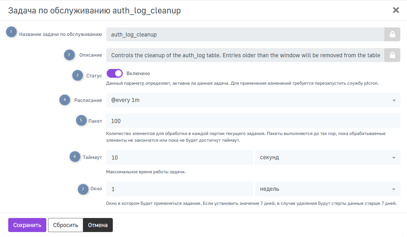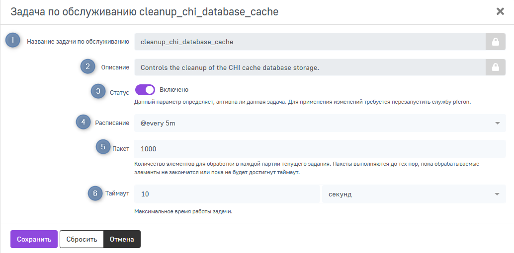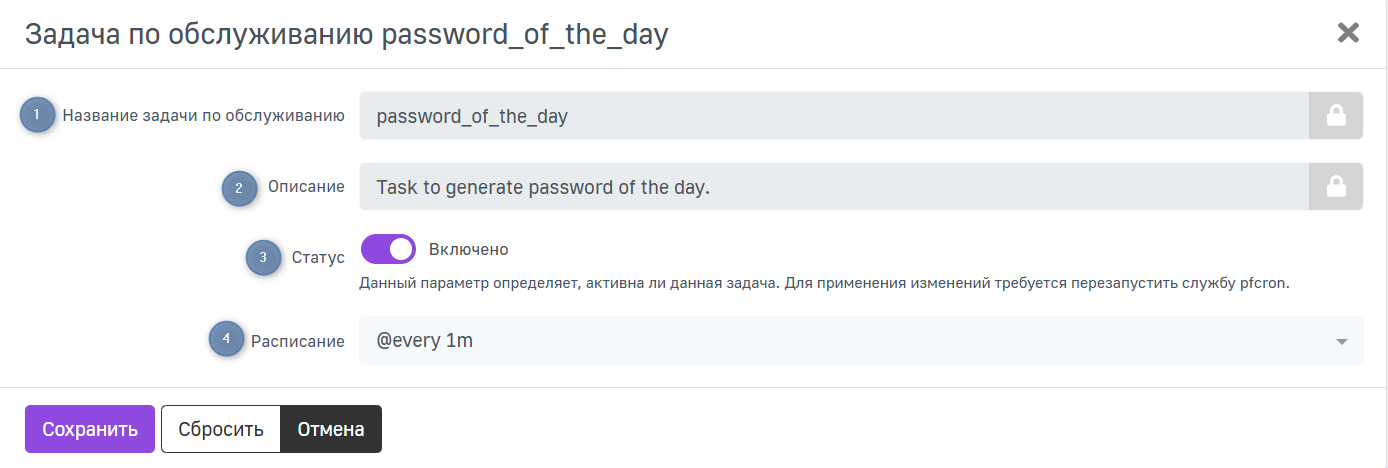 - Статус — при активации данного параметра задача становится активной. Для применения изменений требуется перезапустить службу pfcron;