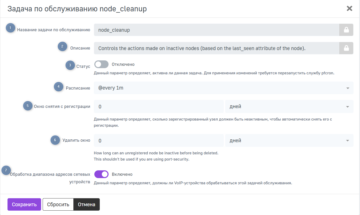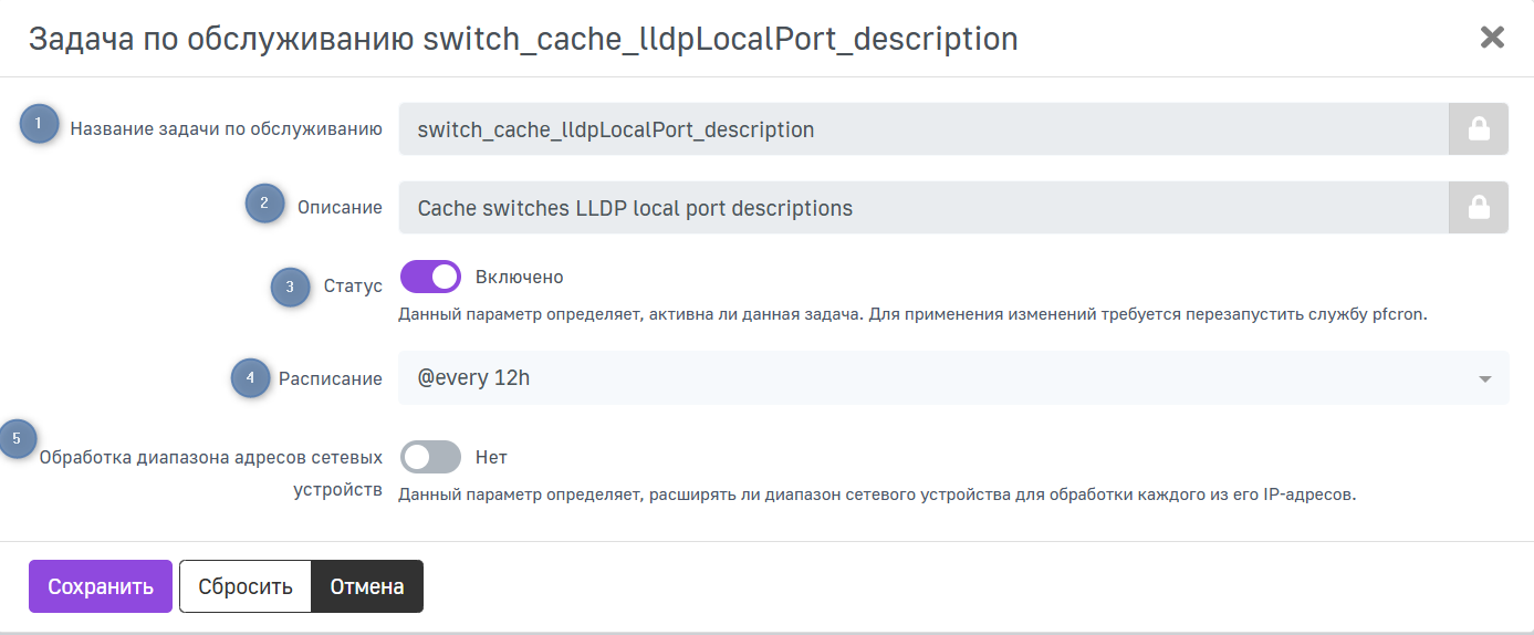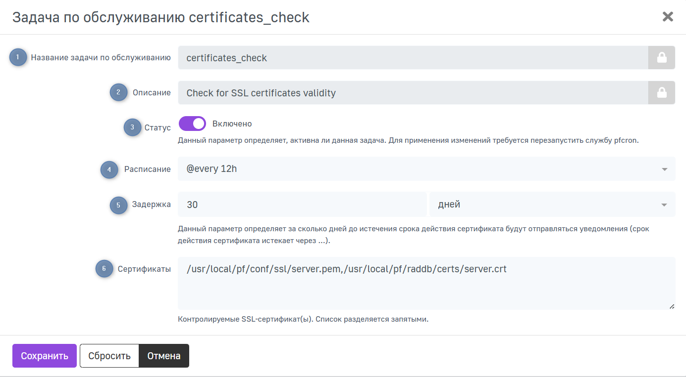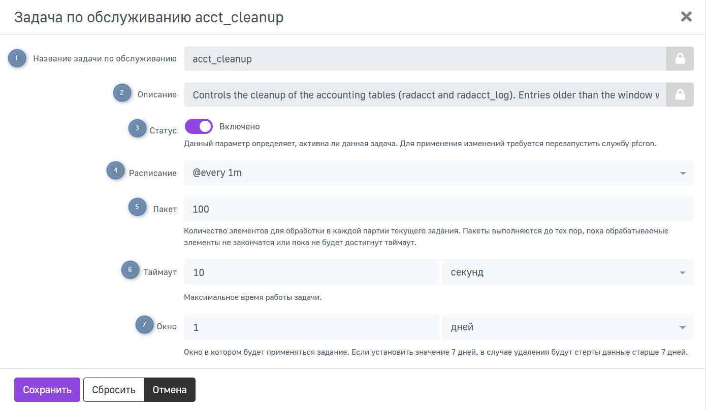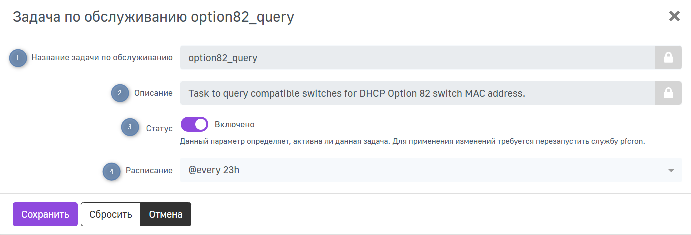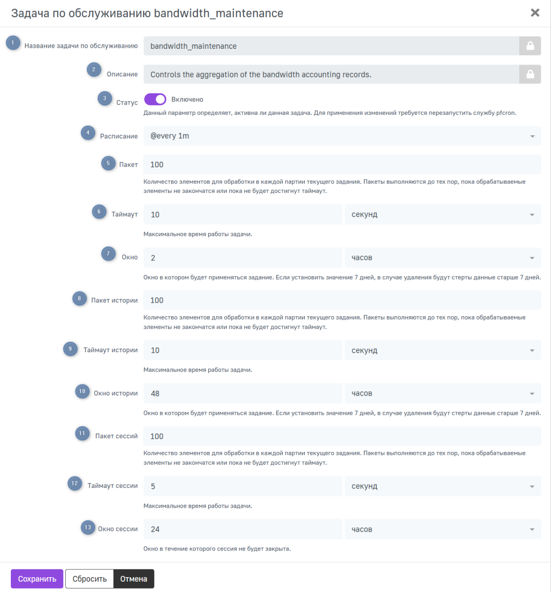 - Статус — при активации данного параметра задача становится активной. Для применения изменений требуется перезапустить службу pfcron;