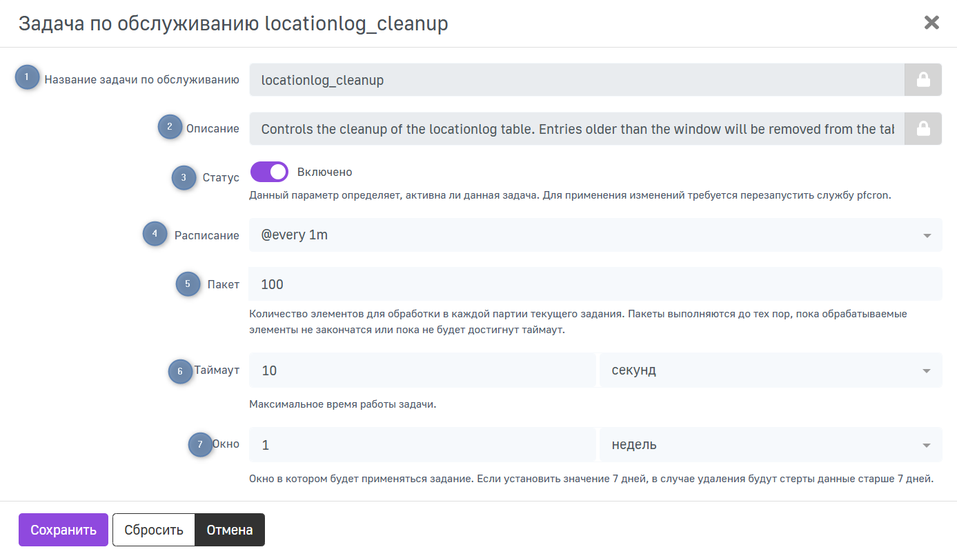 Данная задача управляет очисткой таблицы locationlog. Из таблицы будут удалены записи старше указанного диапазона.