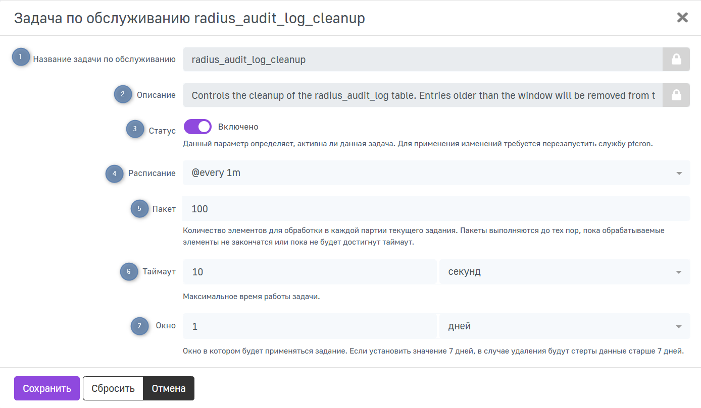 Данная задача управляет очисткой таблицы radius_audit_log. Из таблицы будут удалены записи старше указанного диапазона.