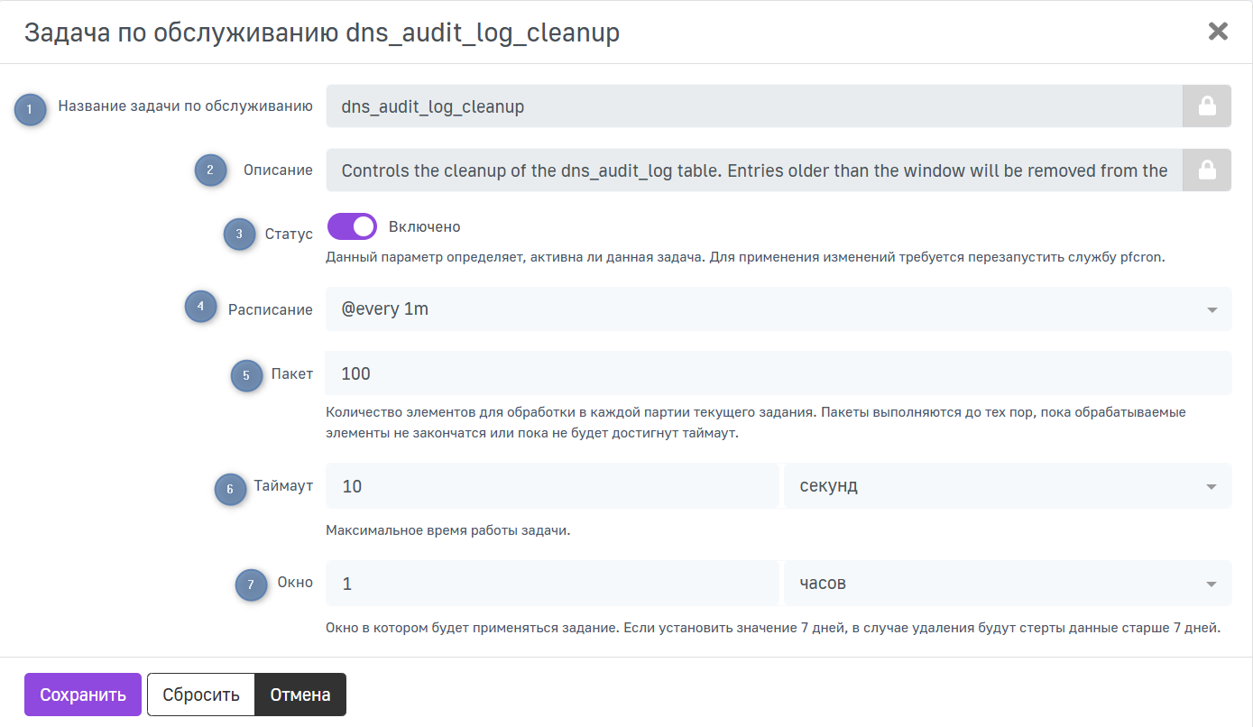 Данная задача управляет очисткой таблицы dns_audit_log. Из таблицы будут удалены записи старше указанного диапазона.