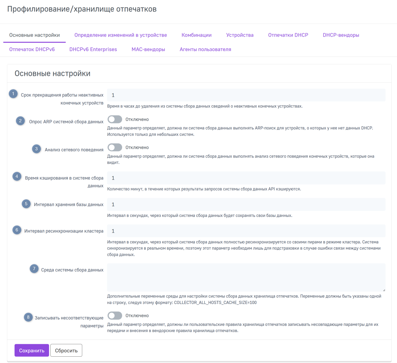 Чтобы сохранить параметры, отвечающие за определение смены устройства в хранилище отпечатков, нажмите Сохранить. Чтобы сбросить введенные параметры на последние сохраненные, нажмите Сбросить.