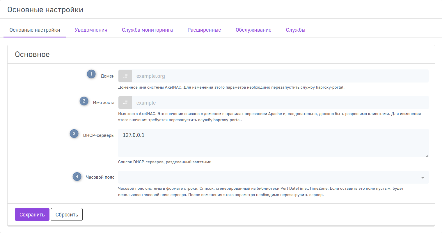 Вкладка «Основные настройки» предназначена для базовой конфигурации параметров системы AxelNAC, включая сетевые настройки, доменное имя, имя хоста, часовой пояс и DHCP-серверы. Эти параметры влияют на корректную работу веб-интерфейса и взаимодействие системы с клиентскими устройствами.
