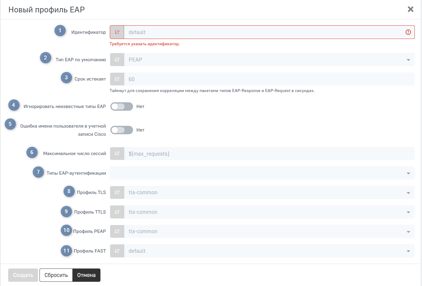 Для того чтобы создать новый профиль EAP, заполните параметры конфигурации и нажмите Создать. Чтобы сбросить введенные параметры на стандартные значения, нажмите Сбросить. Для возвращения на предыдущую страницу без сохранения выполненных на странице действий, нажмите Отменить.