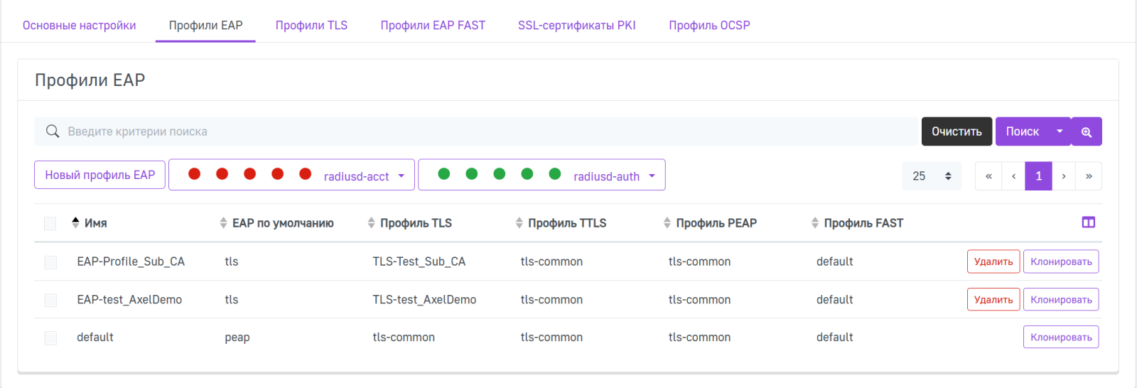 Для того чтобы найти определенный профиль EAP, можно выполнить поиск по критериям: Имя, EAP по умолчанию, Профиль TLS, Профиль TTLS, Профиль PEAP, Профиль FAST. Введите интересующий критерий в поле поиска и нажмите Поиск. Нажмите Очистить, чтобы сбросить критерии поиска.