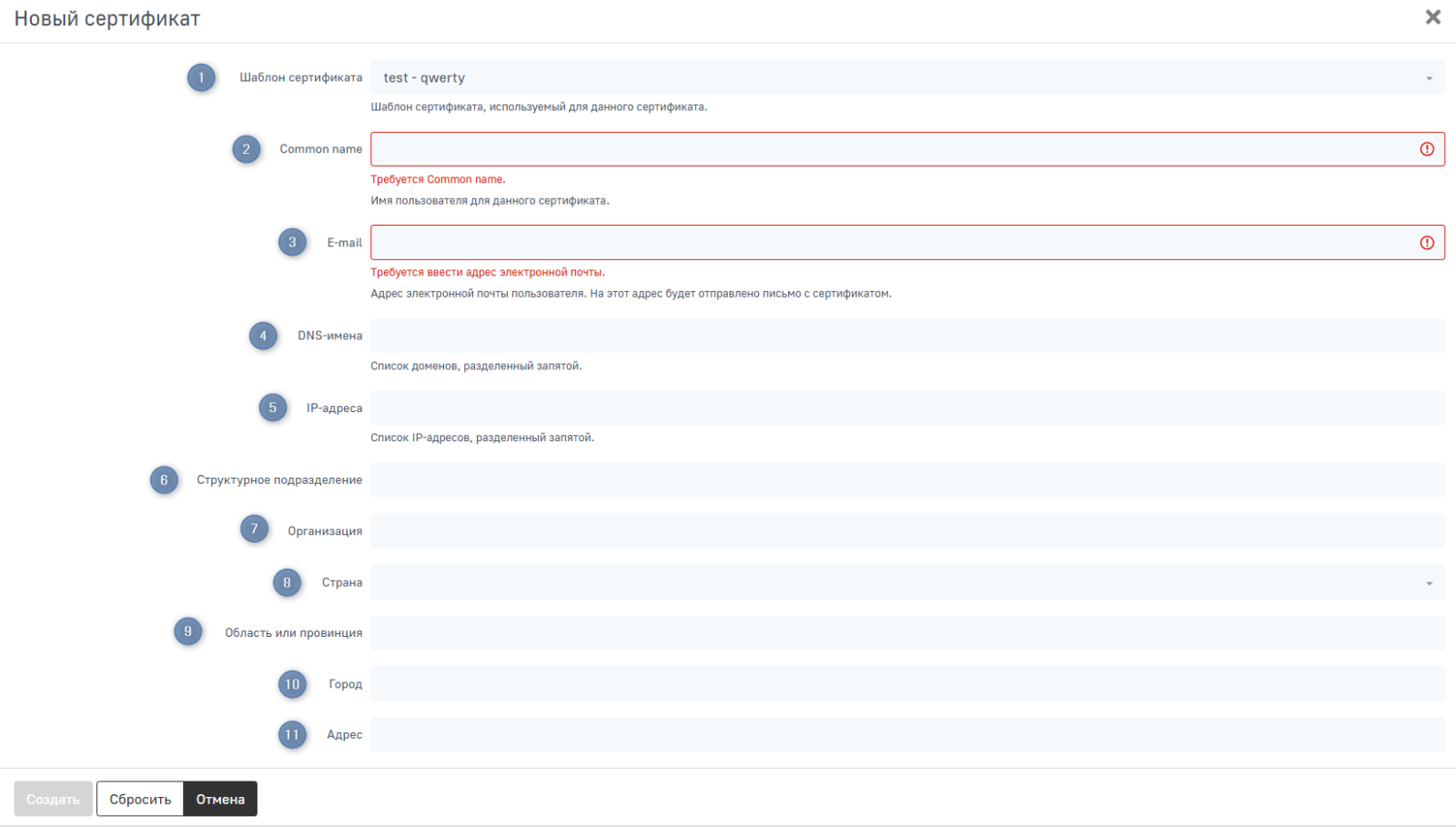 Создание нового сертификатаДля того чтобы создать новый сертификат, нажмите Новый сертификат в левом верхнем углу страницы. Создание производится на основе выбранного шаблона. После этого откроется меню конфигурации шаблона.