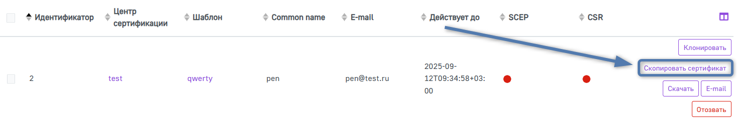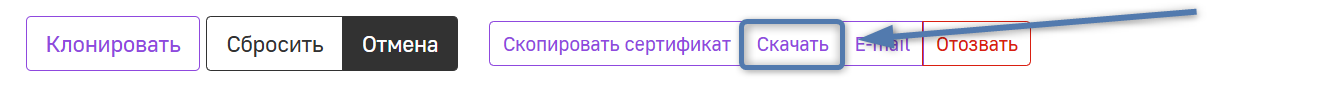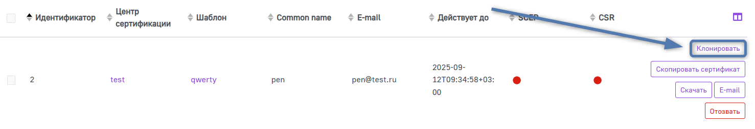 Также в режиме редактирования сертификата вы можете в конце страницы нажать кнопку Клонировать.