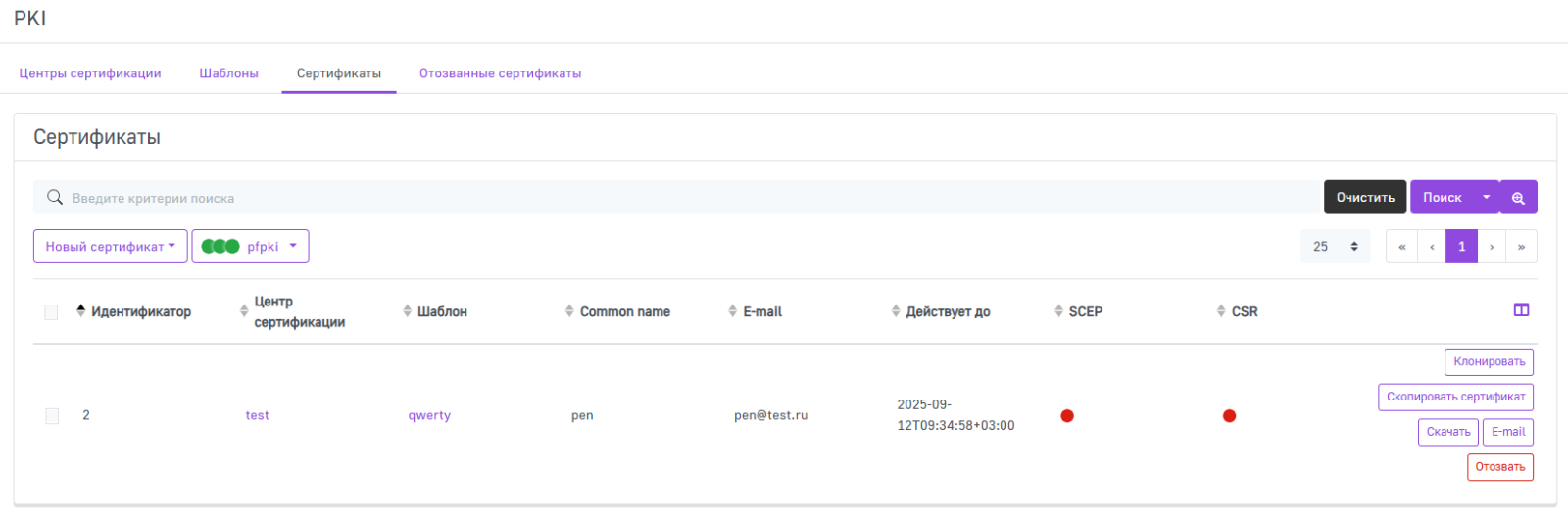Для того чтобы создать новый сертификат, заполните параметры конфигурации и нажмите Создать. Чтобы сбросить введенные параметры на стандартные значения, нажмите Сбросить. Для возвращения на предыдущую страницу без сохранения выполненных на странице действий, нажмите Отменить. Поиск сертификатаДля того чтобы найти определенный сертификат, можно выполнить поиск по критериям: Идентификатор, Центр сертификации, Шаблон, Common name или E-mail. Введите интересующий критерий в поле поиска и нажмите Поиск. Нажмите Очистить, чтобы сбросить критерии поиска.