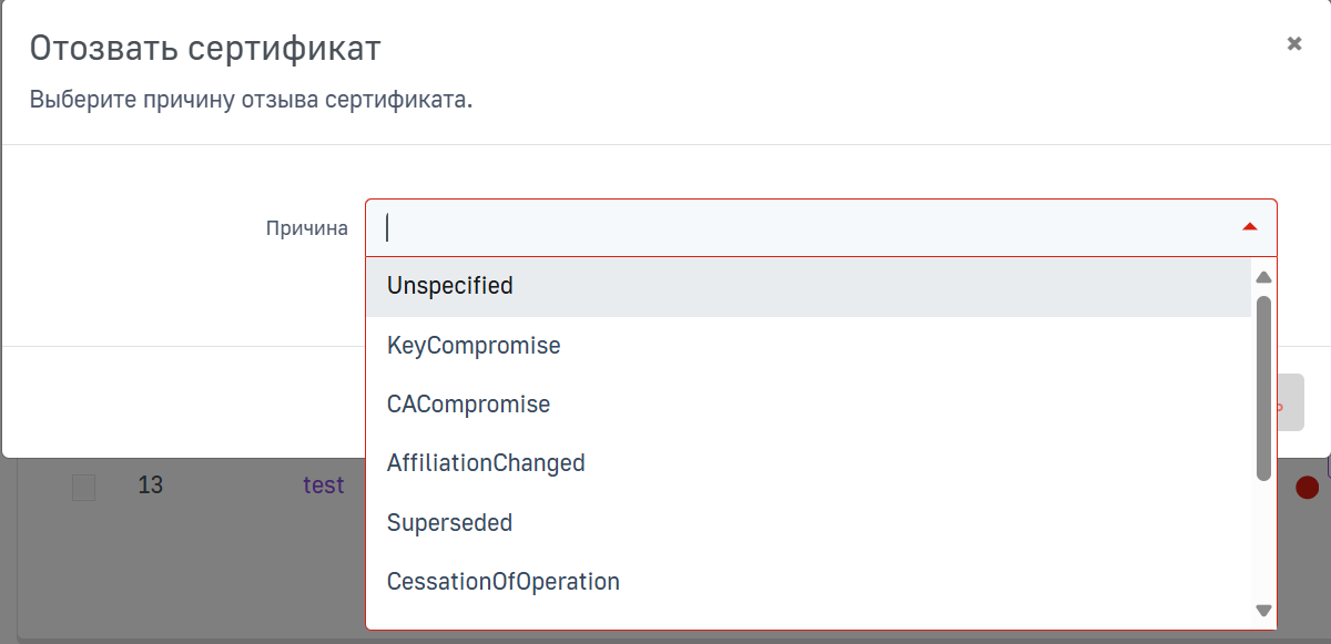 После этого вам будет предложено выбрать причину отзыва сертификата.