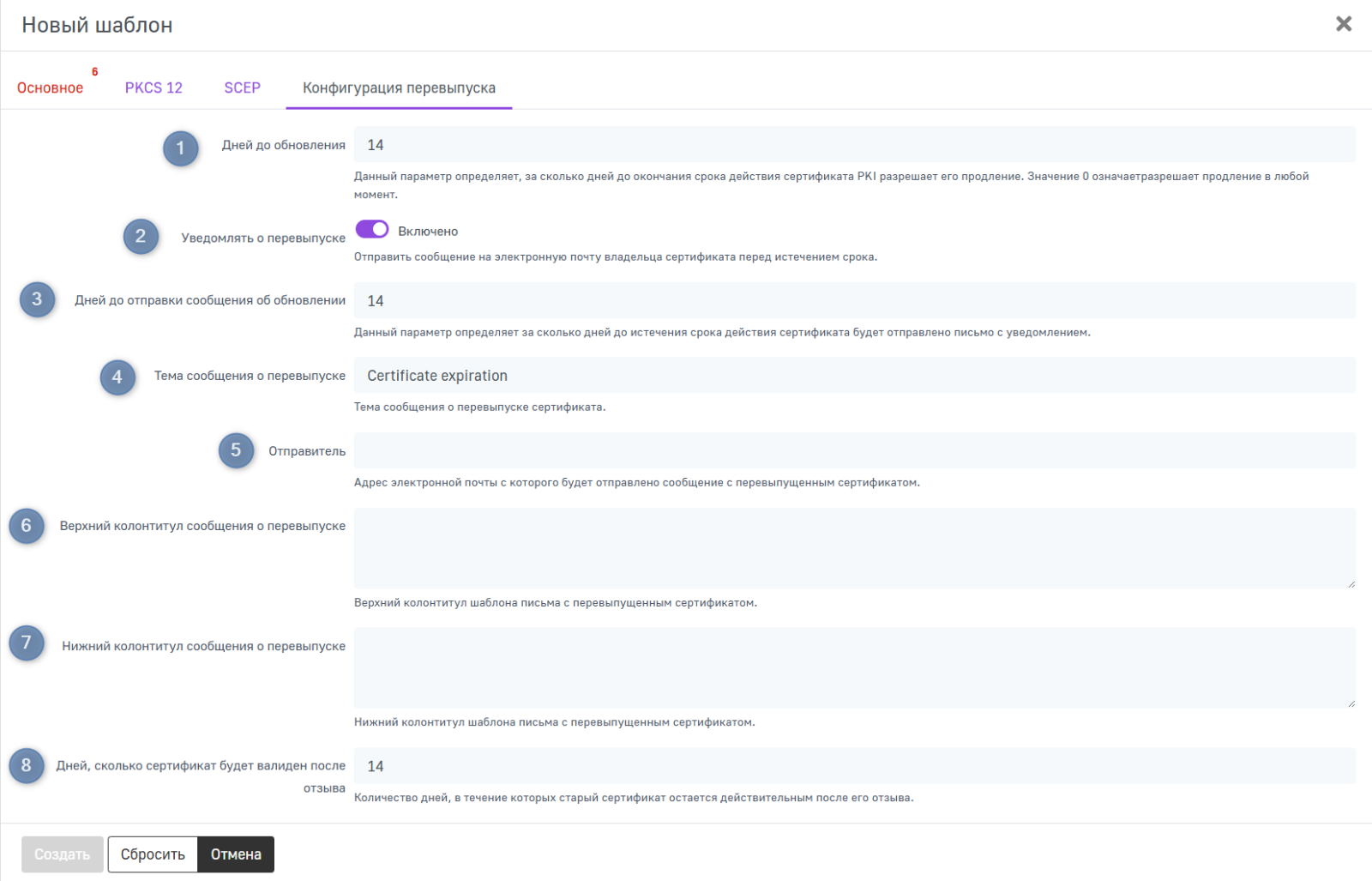 На данной вкладке можно указать параметры перевыпуска сертификатов.