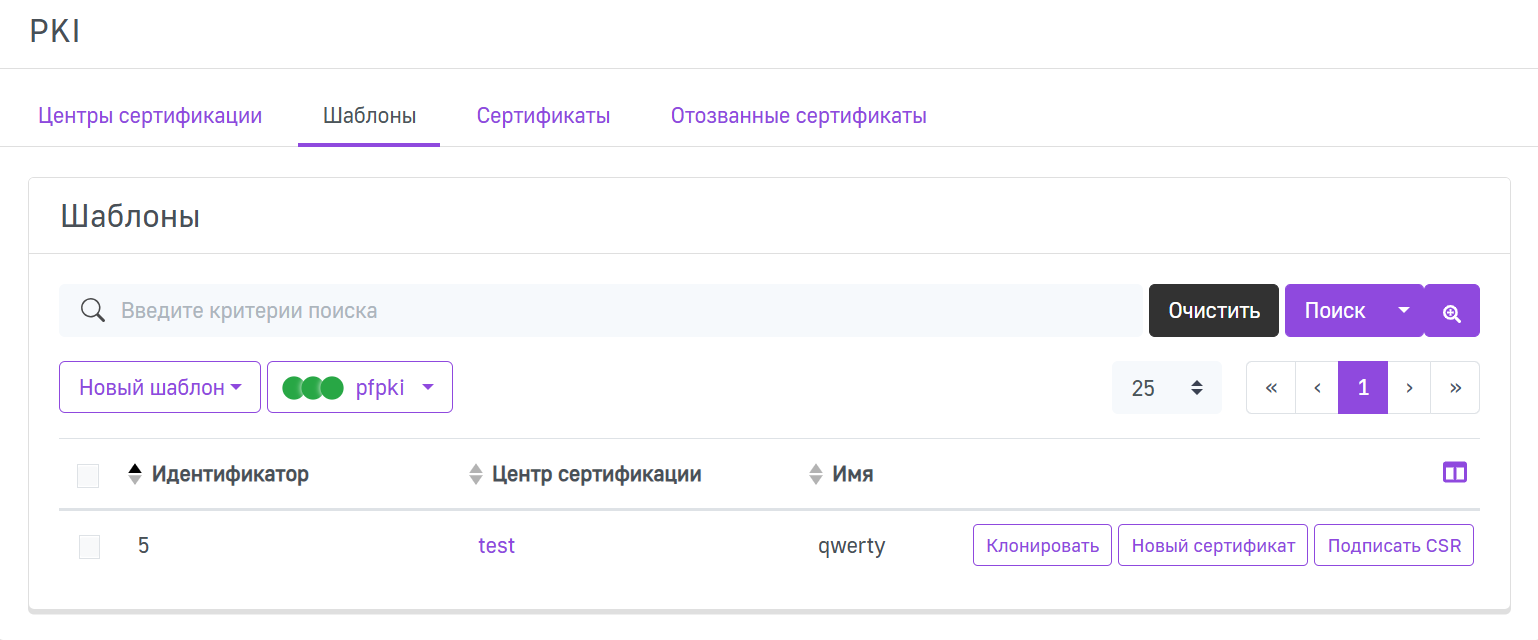 Для того чтобы найти определенный шаблон, можно выполнить поиск по критериям: Идентификатор, Центр сертификации, Имя. Введите интересующий критерий в поле поиска и нажмите Поиск. Нажмите Очистить, чтобы сбросить критерии поиска.