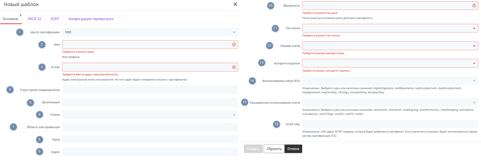 Для того чтобы создать новый шаблон, нажмите Новый шаблон в левом верхнем углу страницы. Создание производится на основе выбранного центра сертификации. После этого откроется меню конфигурации шаблона.
